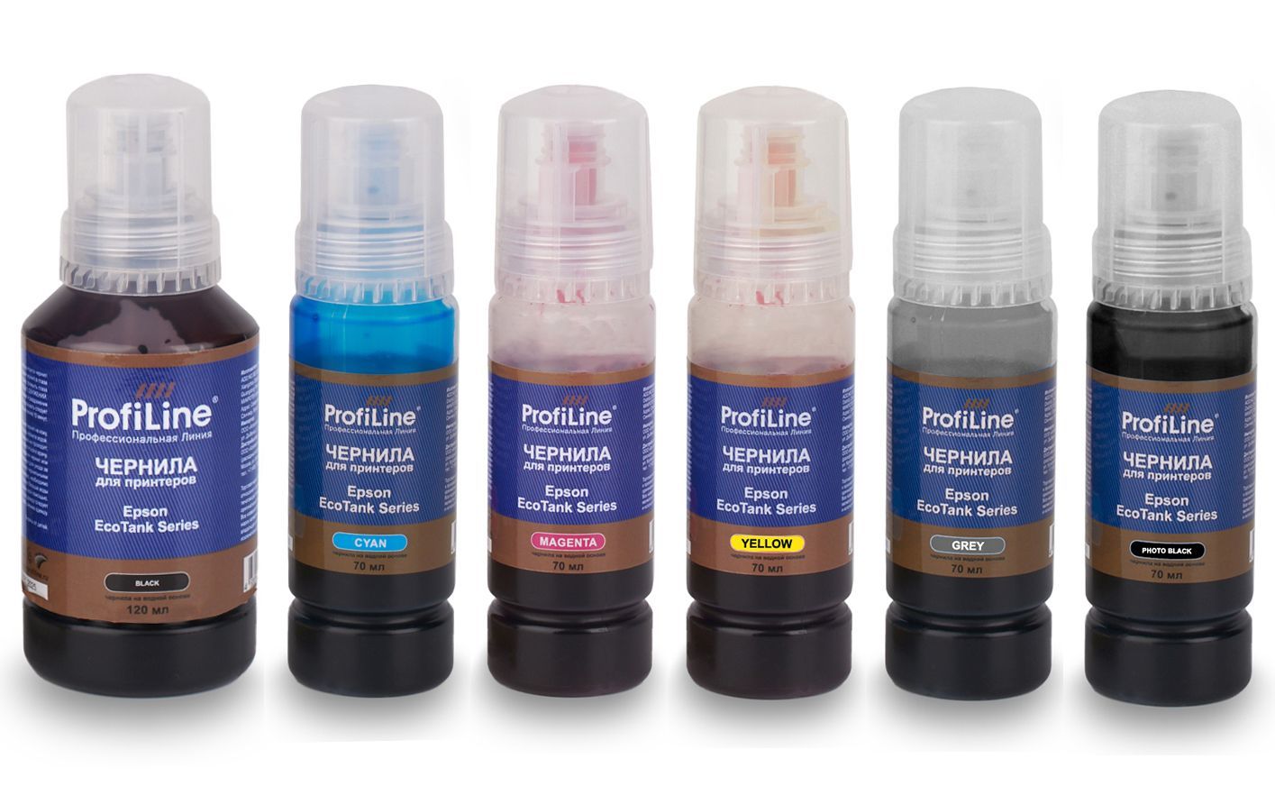 Комплект универсальных чернил для Epson серии EcoTank/L с чернилами на водной основе Black/Cyan/Magenta/Yellow/Photo Black/Grey 120мл/5*70мл ProfiLine
